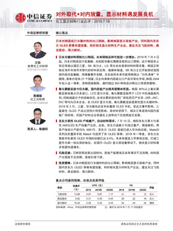 【中信证券】【20190718】化工显示材料行业点评:对外取代+对内放量,显示材料遇发展良机-3页 行业研究