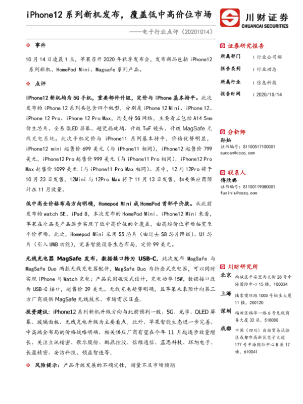 【川财证券】【20201014】电子行业点评:iPhone12系列新机发布,覆盖低中高价位市场-2页 证券期货研究报告