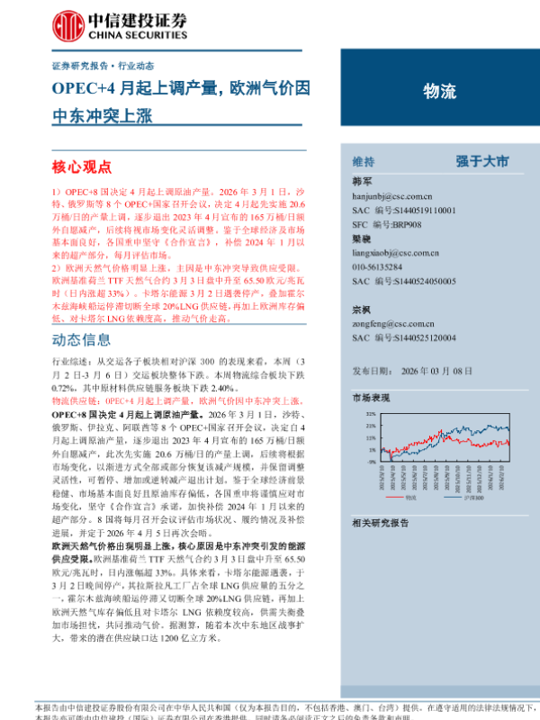 【中信建投证券】【202603】物流行业:OPEC+4月起上调产量,欧洲气价因中东冲突上涨-14页 证券期货研究报告