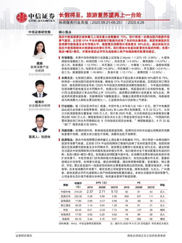 【中信证券】【20200928】休闲服务行业周报:长假将至,旅游复苏望再上一台阶-14页 行业研究