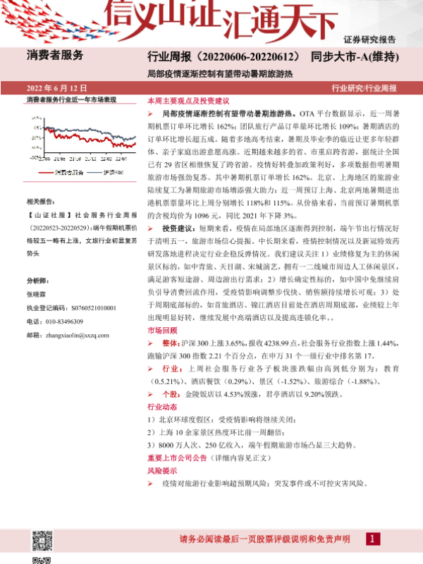 【山西证券】【20220612】消费者服务行业周报:局部疫情逐渐控制有望带动暑期旅游热-11页 行业研究