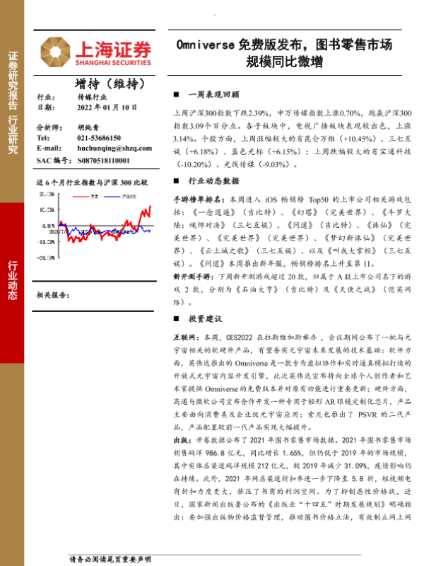 【上海证券】【20220110】20220110-上海证券-互联网传媒行业周报:Omniverse免费版发布,图书零售市场规模同比微增-9页 行业研究
