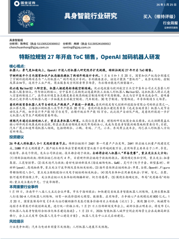 【国金证券】【202601】具身智能行业研究:特斯拉规划27年开启ToC销售,OpenAI加码机器人研发-17页 证券期货研究报告