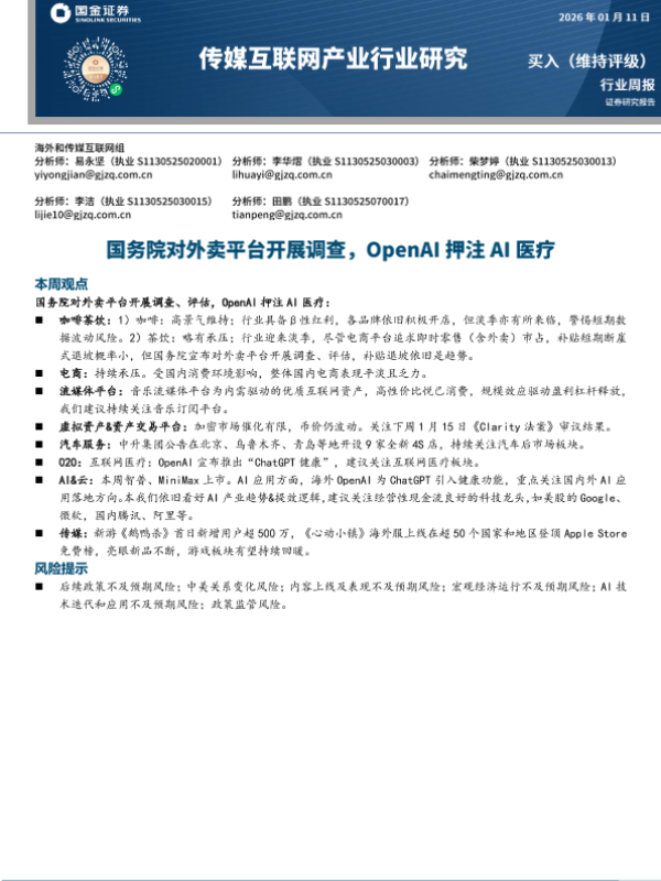 【国金证券】【202601】国务院对外卖平台开展调查,OpenAI押注AI医疗-13页 证券期货研究报告