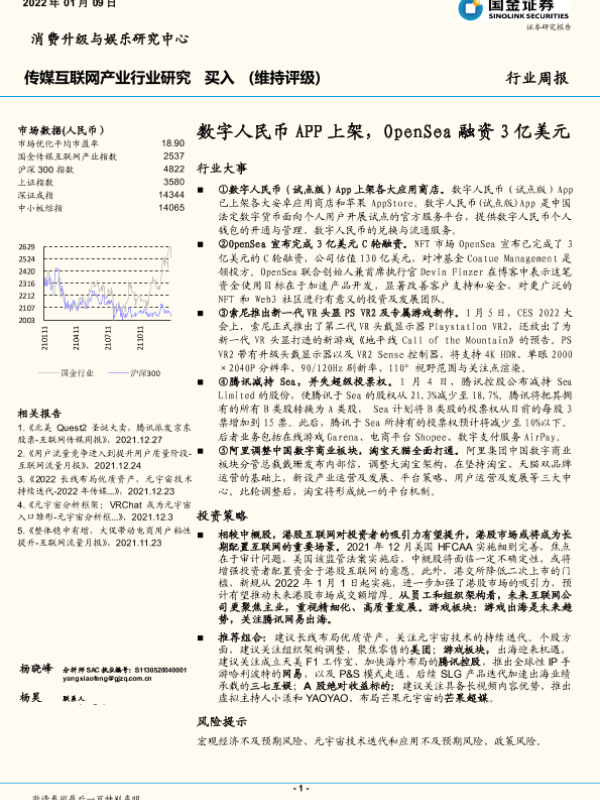 【国金证券】【20220109】20220109-国金证券-传媒互联网产业行业周报:数字人民币APP上架,OpenSea融资3亿美元-15页 行业研究