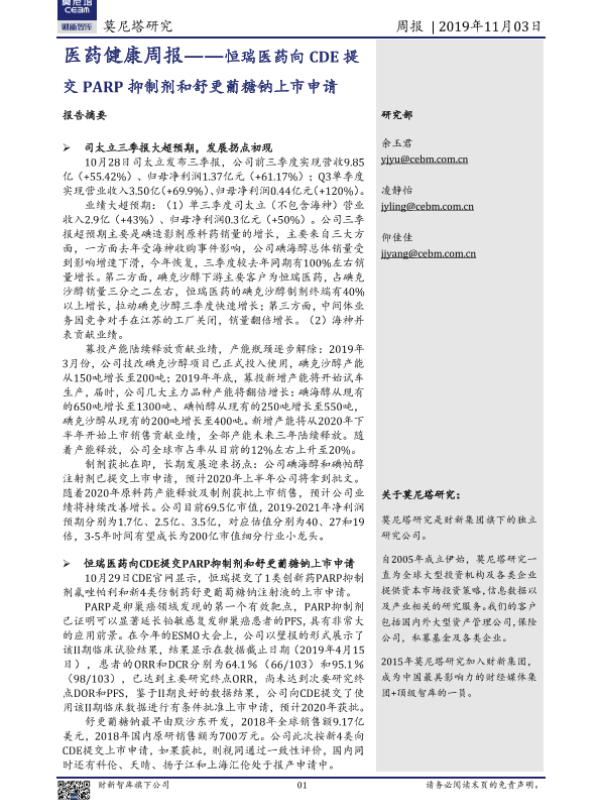 【莫尼塔研究】【20191103】医药健康周报:恒瑞医药向CDE提交PARP抑制剂和舒更葡糖钠上市申请-12页 行业研究