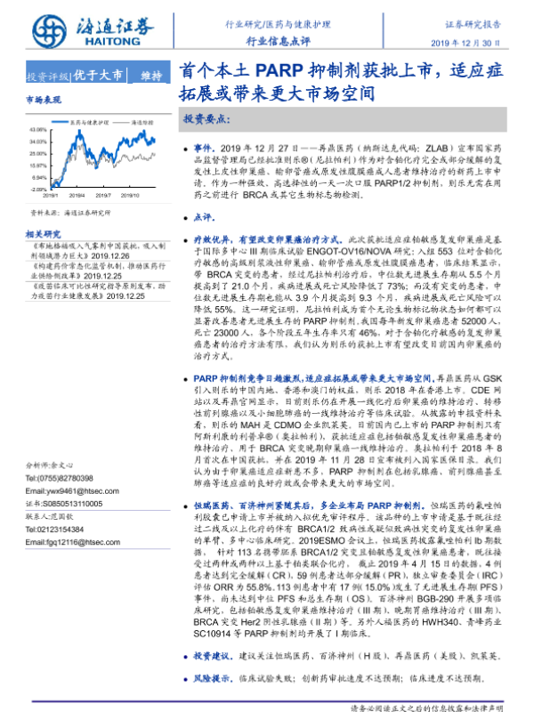【海通证券】【20191230】首个本土PARP抑制剂获批上市,适应症拓展或带来更大市场空间-2页 行业研究
