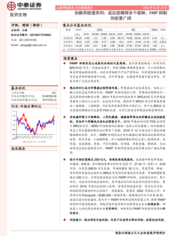 【中泰证券】【20200223】医药生物行业深度报告:创新药梳理系列:适应症横跨多个癌种,PARP抑制剂前景广阔-20页 行业研究