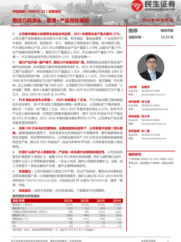 【民生证券】【20220601】20220601-民生证券-中钨高新-000657.SZ-深度报告:数控刀具龙头,管理+产品双轮驱动-36页 行业研究