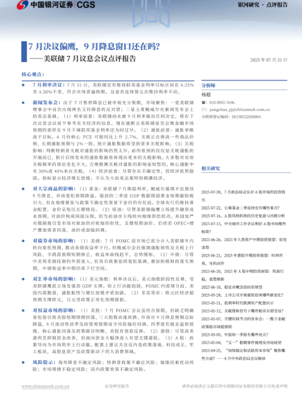 【银河证券】【20250731】美联储7月议息会议点评报告:7月决议偏鹰,9月降息窗口还在吗-10页 宏观策略
