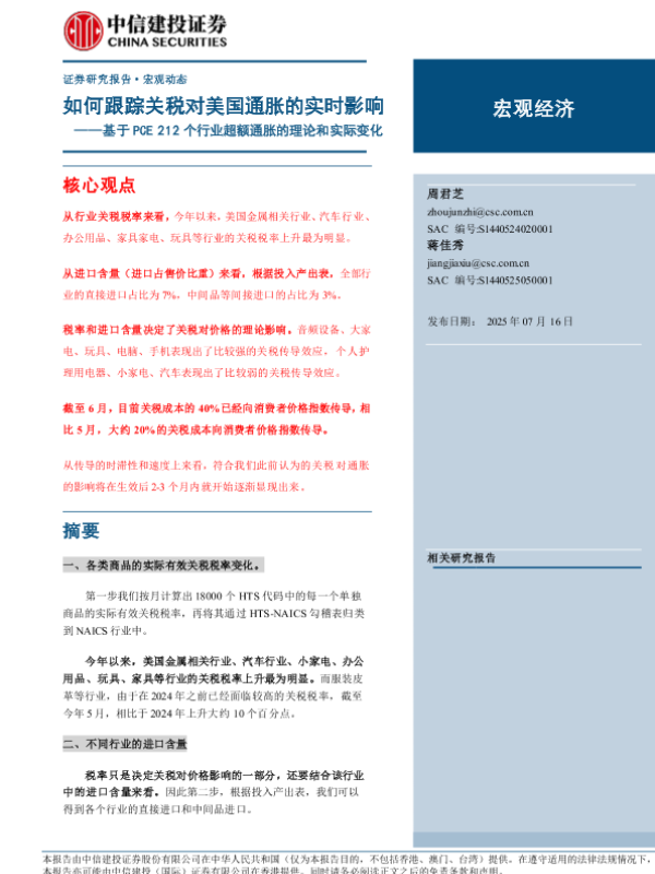 【中信建投证券】【20250716】基于PCE+212个行业超额通胀的理论和实际变化:如何跟踪关税对美国通胀的实时影响-13页 证券期货研究报告