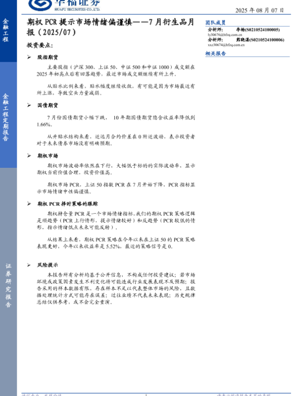【华福证券】【202507】期权 PCR提示市场情绪偏谨慎——7月衍生品月报(2025/07)-16页 证券期货研究报告