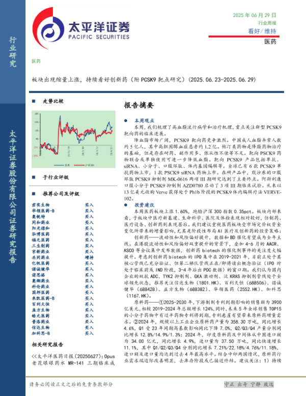【太平洋证券】【20250629】医药行业周报:板块出现缩量上涨,持续看好创新药(附PCSK9靶点研究)-21页 行业研究