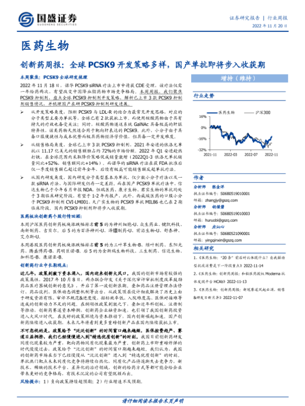 【国盛证券】【20221120】创新药周报:全球PCSK9开发策略多样,国产单抗即将步入收获期-18页 行业研究