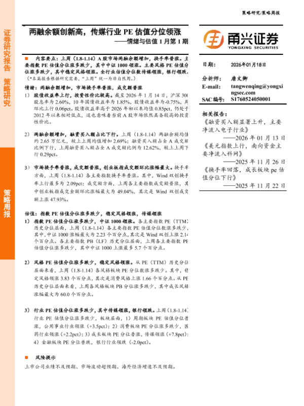 【甬兴证券】【202601】两融余额创新高,传媒行业 PE估值分位领涨——情绪与估值 1月第 1期-11页 证券期货研究报告