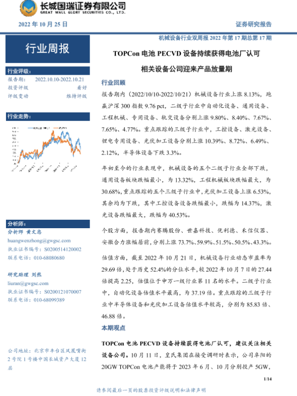 【长城国瑞证券】【20221025】机械设备行业双周报2022年第17期总第17期:TOPCon电池PECVD设备持续获得电池厂认可相关设备公司迎来产品放量期-14页 行业研究