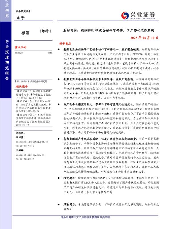 【兴业证券】【20230410】射频电源:刻蚀&PECVD设备核心零部件,国产替代迫在眉睫-26页 行业研究