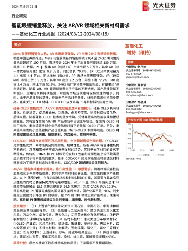 【光大证券】【20240817】基础化工行业周报:智能眼镜销量释放,关注AR VR领域相关新材料需求-27页 行业研究
