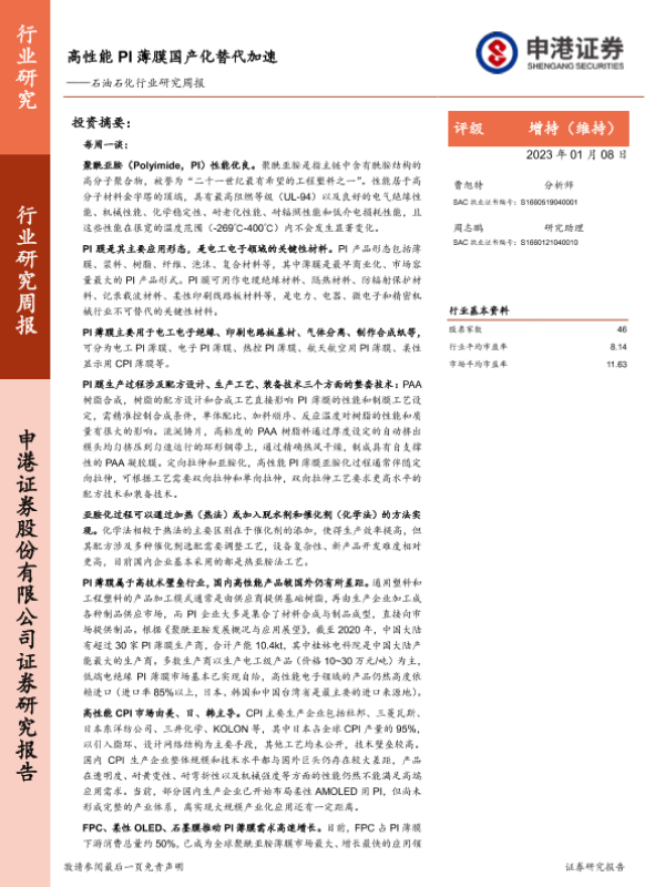 【申港证券】【20230108】20230108-申港证券-石油石化行业研究周报:高性能PI薄膜国产化替代加速-18页 行业研究