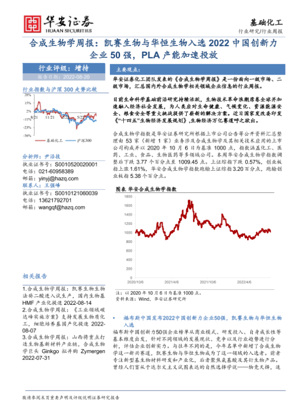 【华安证券】【20220820】合成生物学周报:凯赛生物与华恒生物入选2022中国创新力企业50强,PLA产能加速投放-25页 行业研究