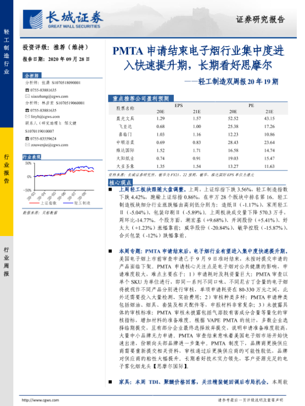 【长城证券】【20200928】轻工制造双周报20年19期:PMTA申请结束电子烟行业集中度进入快速提升期,长期看好思摩尔-30页 行业研究
