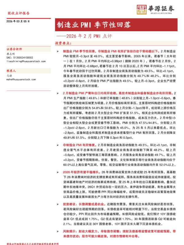 【华源证券】【202603】制造业 PM I季节性回落——2026年 2月 PM I点评-3页 证券期货研究报告
