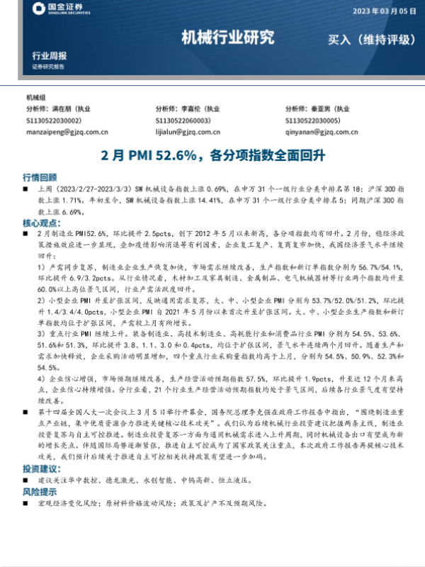 【国金证券】【20230305】20230305-国金证券-机械行业研究:2月PMI52.6%,各分项指数全面回升-15页 行业研究