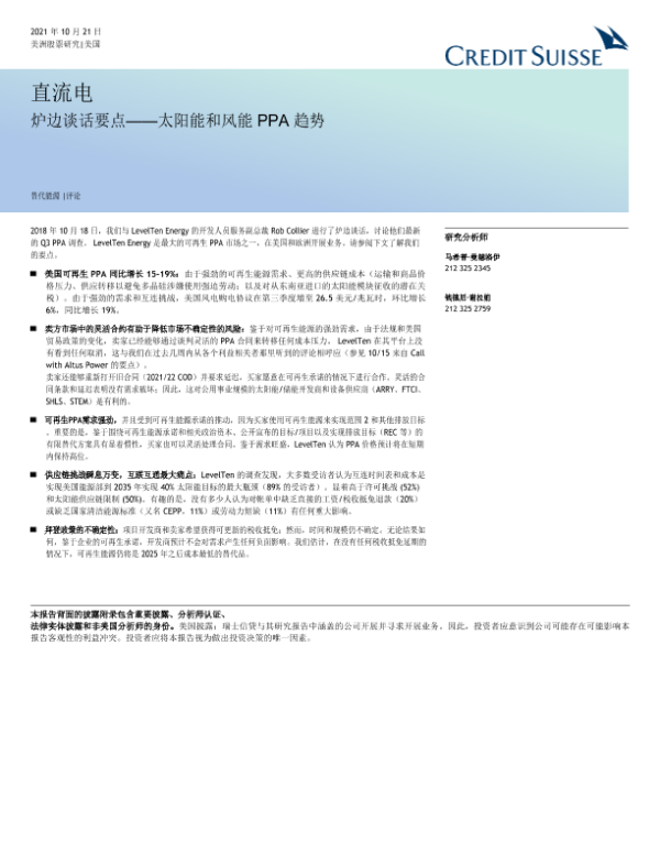 【瑞信】【20211021】美股能源行业炉边谈话要点:太阳能和风能PPA趋势-24页 会议纪要