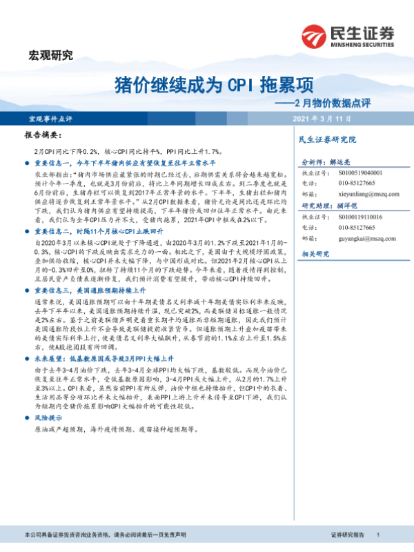 【民生证券】【20210311】2月物价数据点评:猪价继续成为CPI拖累项-12页 宏观策略