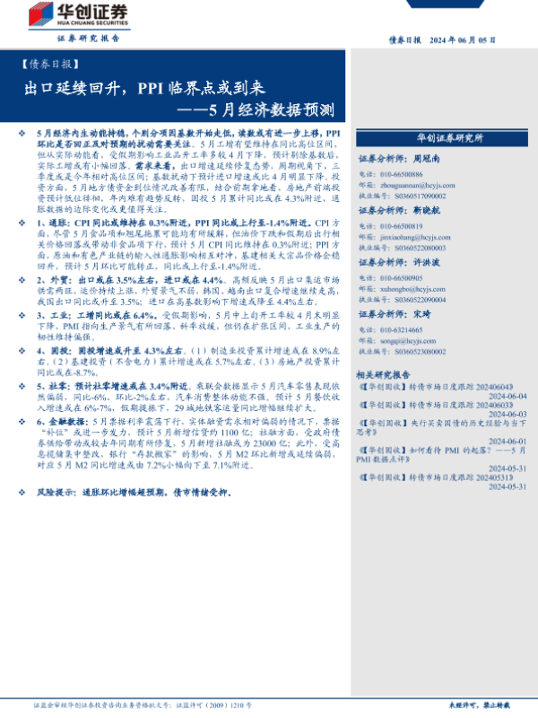 【华创证券】【20240605】5月经济数据预测:出口延续回升,PPI临界点或到来-13页 行业研究