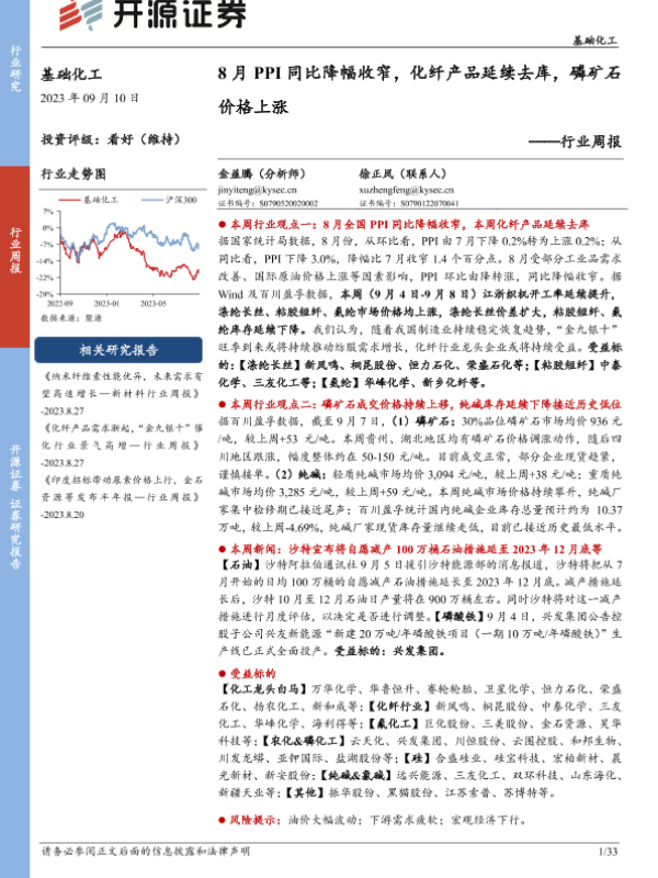 【开源证券】【20230910】20230910-开源证券-基础化工行业周报:8月PPI同比降幅收窄,化纤产品延续去库,磷矿石价格上涨-33页 行业研究
