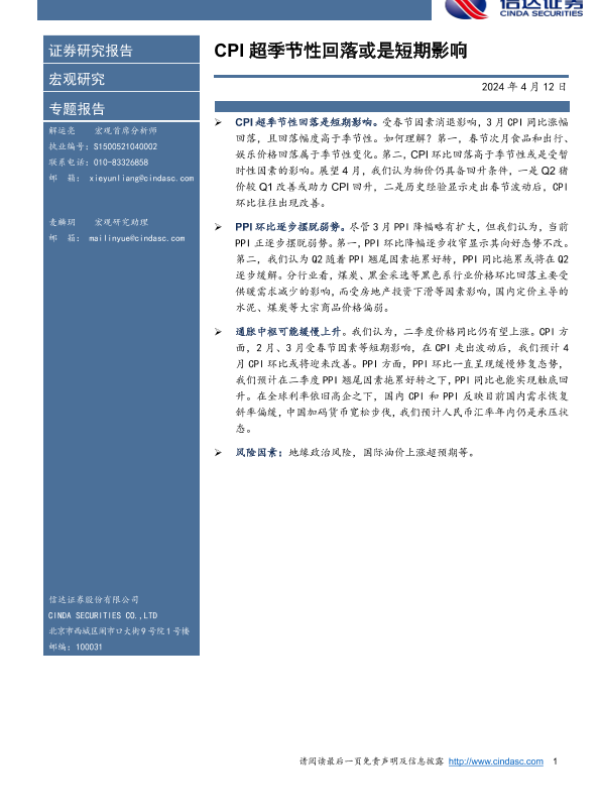 【信达证券】【20240412】CPI超季节性回落或是短期影响-10页 宏观策略