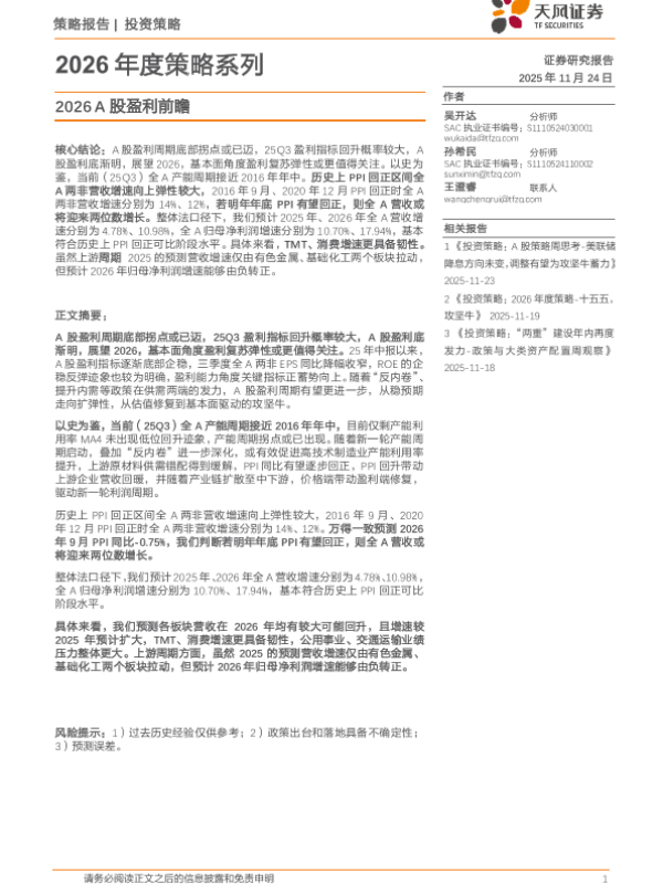 【天风证券】【202511】2026A股盈利前瞻-7页 证券期货研究报告