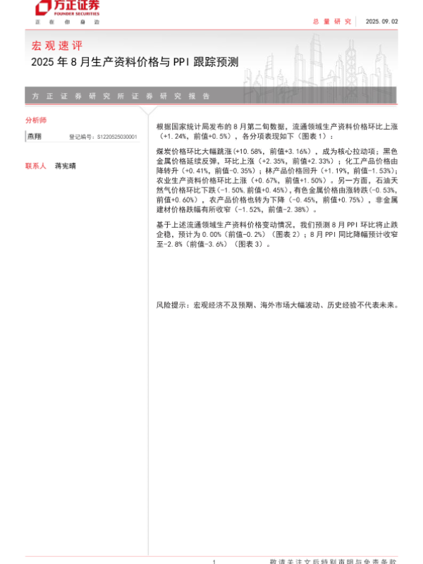 【方正证券】【20250902】2025年8月生产资料价格与PPI跟踪预测-4页 证券期货研究报告