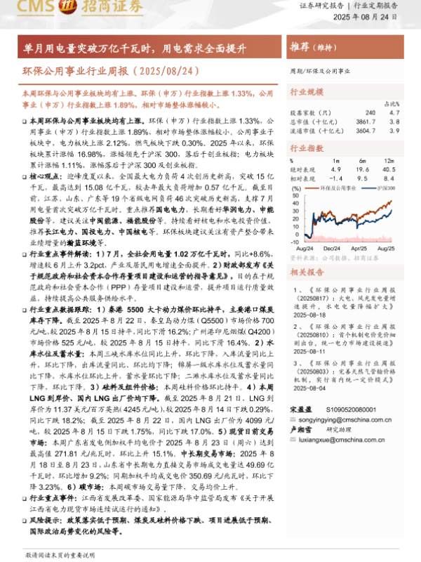 【CMS招商证券】【20250824】环保公用事业行业周报:单月用电量突破万亿千瓦时,用电需求全面提升-26页 证券期货研究报告