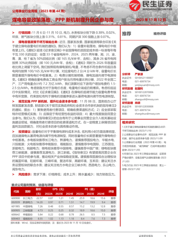 【民生证券】【20231112】公用事业行业周报:煤电容量政策落地,PPP新机制提升民企参与度-26页 行业研究