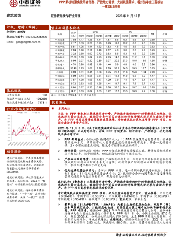 【中泰证券】【20231112】建筑行业周报:PPP新机制聚焦使用者付费、严控地方隐债,光刻机强需求、看好洁净室工程板块-19页 行业研究