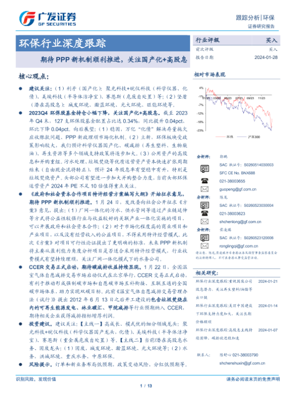 【广发证券】【20240128】环保行业深度跟踪:期待PPP新机制顺利推进,关注国产化+高股息-13页 行业研究