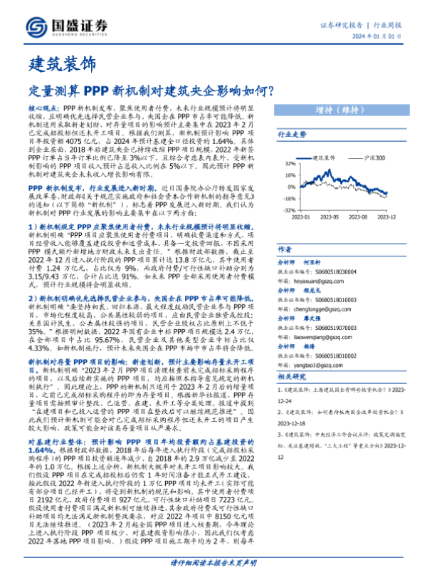 【国盛证券】【20240101】建筑装饰行业周报:定量测算PPP新机制对建筑央企影响如何?-12页 行业研究