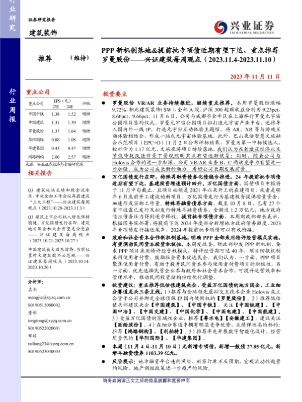 【兴业证券】【20231111】PPP新机制落地&提前批专项债近期有望下达,重点推荐罗曼股份——兴证建筑每周观点-30页 行业研究