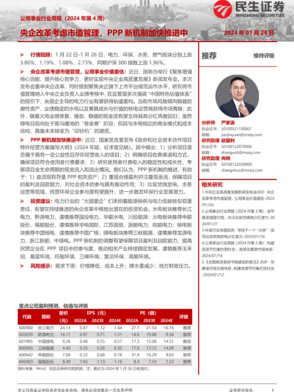 【民生证券】【20240128】公用事业行业周报:央企改革考虑市值管理,PPP新机制加快推进中-27页 行业研究