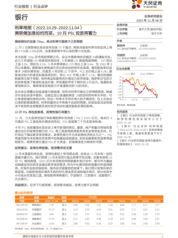 【天风证券】【20221106】银行利率周报:美联储加息如约而至,10月PSL投放再蓄力-10页 行业研究
