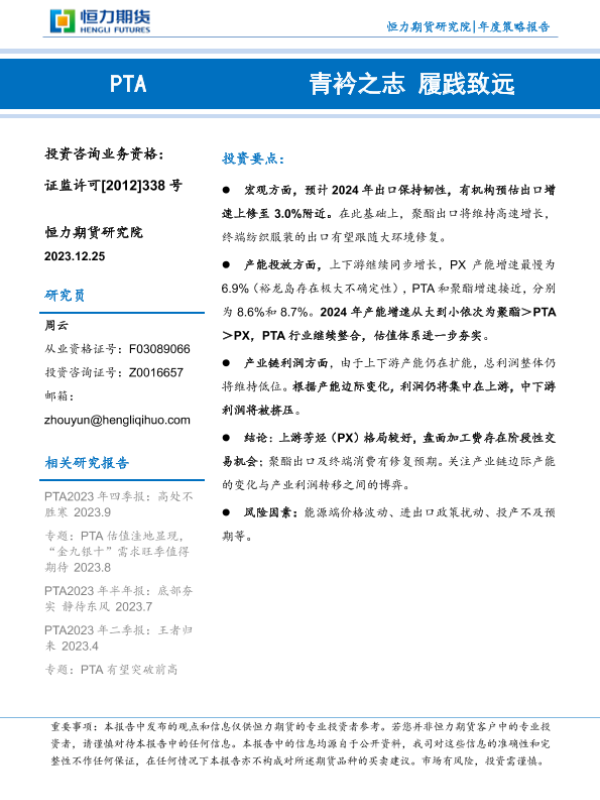 【恒力期货】【20231225】PTA年度策略报告:青衿之志 履践致远-26页 行业研究