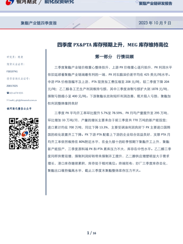 【银河期货】【20231009】聚酯产业链四季度报:四季度PX&PTA库存预期上升,MEG库存维持高位-16页 行业研究