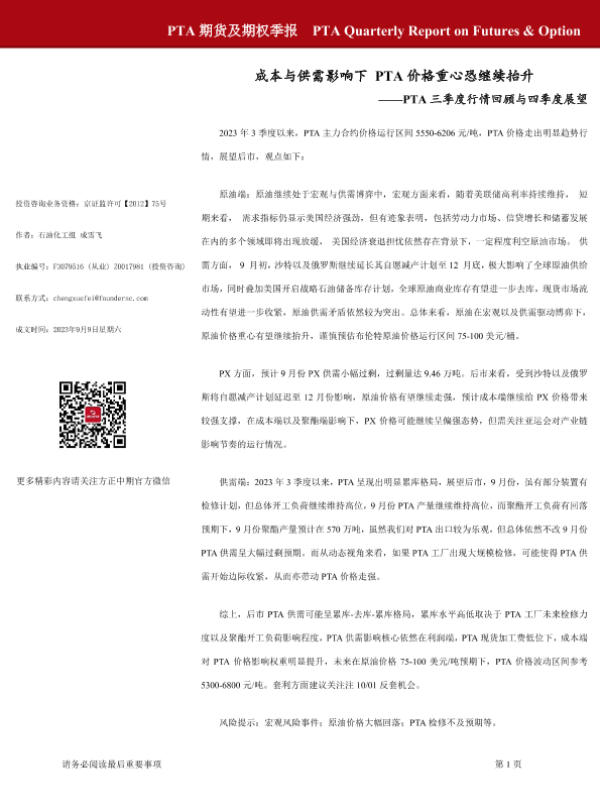 【方正中期期货】【20230909】PTA期货及期权季报-24页 行业研究