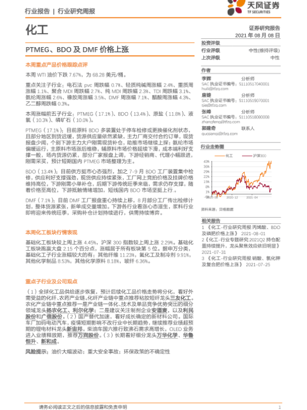 【天风证券】【20210808】20210808-天风证券-化工行业研究周报:PTMEG、BDO及DMF价格上涨-21页 行业研究