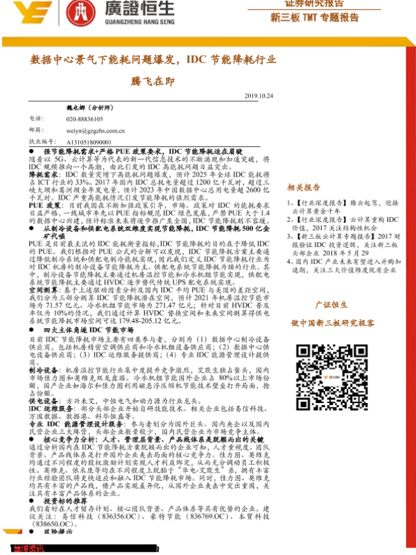 【广证恒生】【20191024】新三板TMT专题报告:数据中心景气下能耗问题爆发,IDC节能降耗行业腾飞在即-28页 行业研究