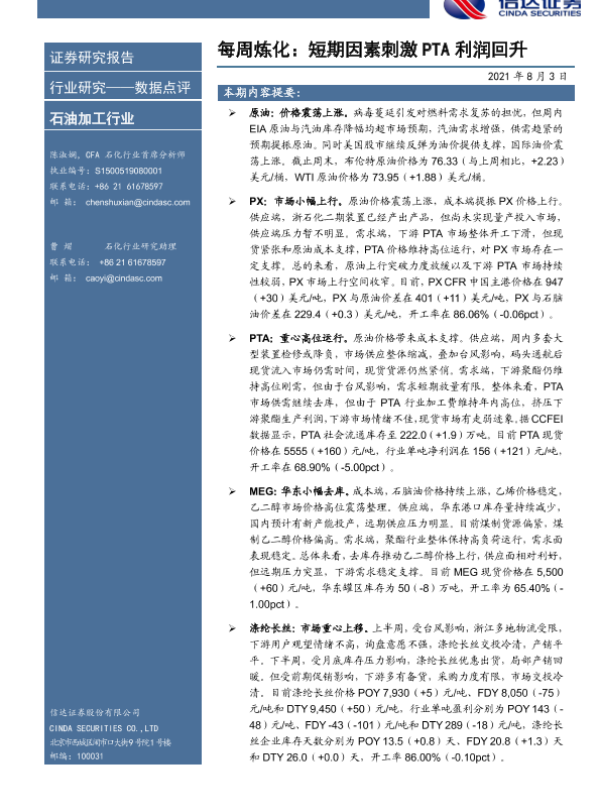 【信达证券】【20210803】每周炼化:短期因素刺激PTA利润回升-9页 行业研究