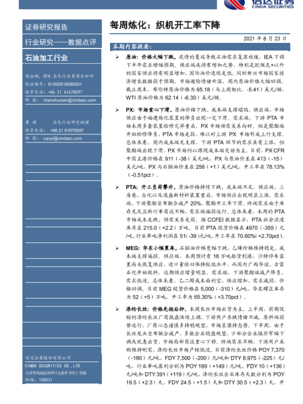 【信达证券】【20210823】每周炼化:织机开工率下降-9页 行业研究