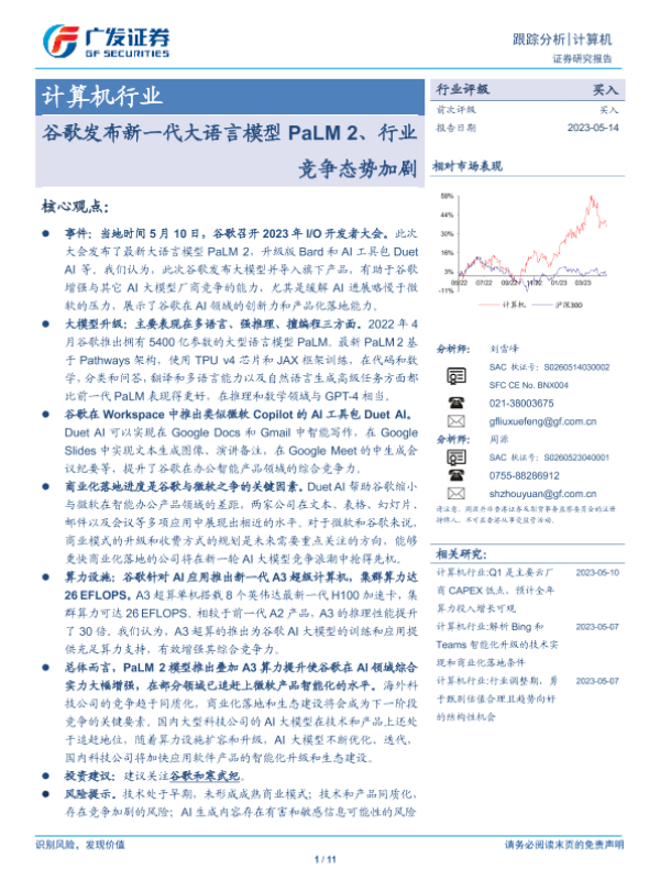 【广发证券】【20230514】计算机行业跟踪分析:谷歌发布新一代大语言模型PaLM2、行业竞争态势加剧-11页 行业研究